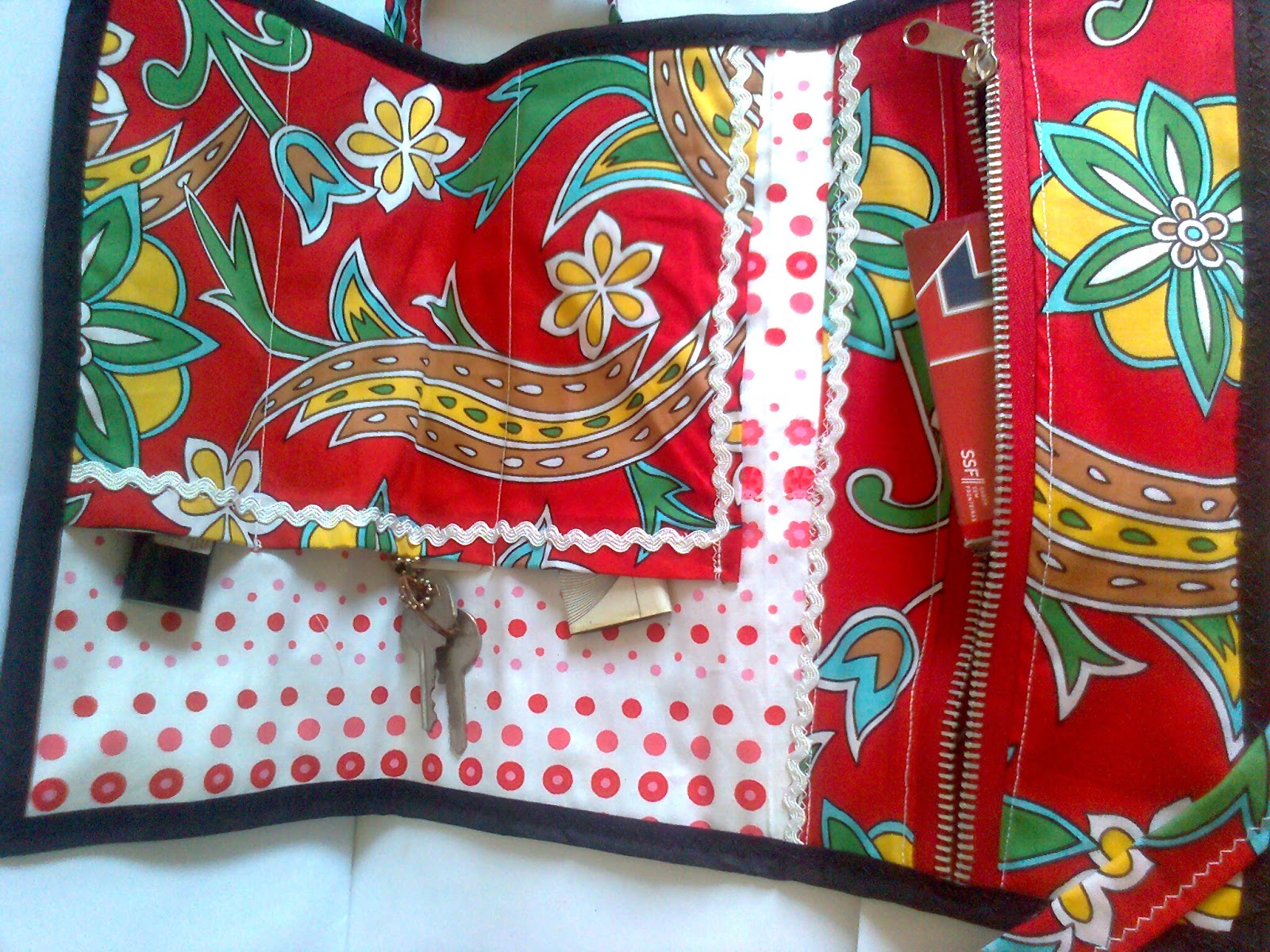 Parte frontal do feche arredondada, com duas divisórias na área interna. Foi utilizado tecido,